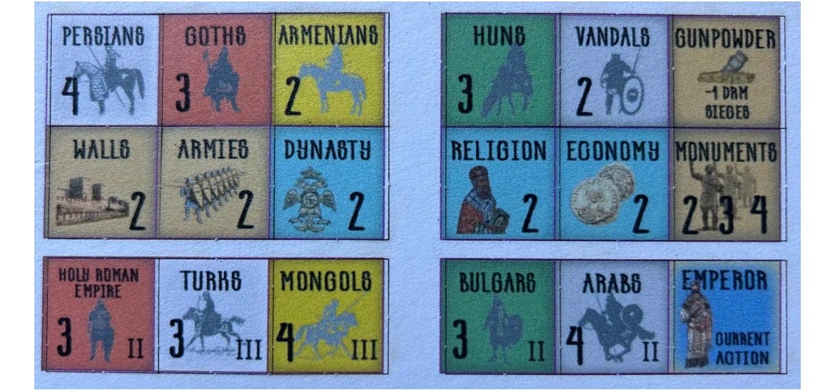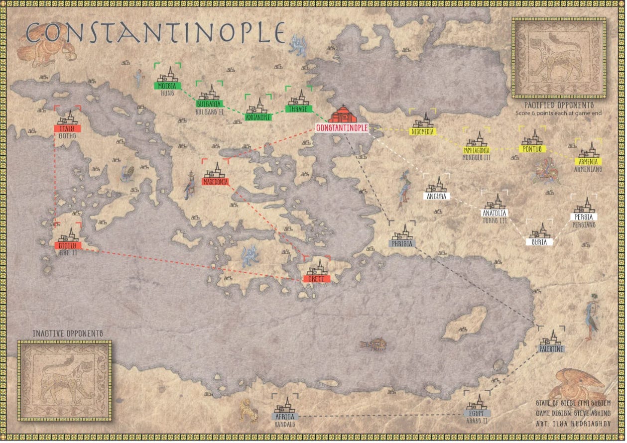 This is definitely one area where some historical compromises were made for the sake of playability. I also find it interesting that some of the Byzantine Emperors had heritages from territories that, in the game, are considered enemies, for example Heraclius was Armenian. Many things that appear clear cut in the game were historical grey areas that were hard to model in the game. The pacification mechanic was how I tried to represent the shifting balance of power and conflict between the Byzantines and their rivals, with mixed success. A more comprehensive game on the Byzantine empire would have many more rivals to choose from to represent in the game.