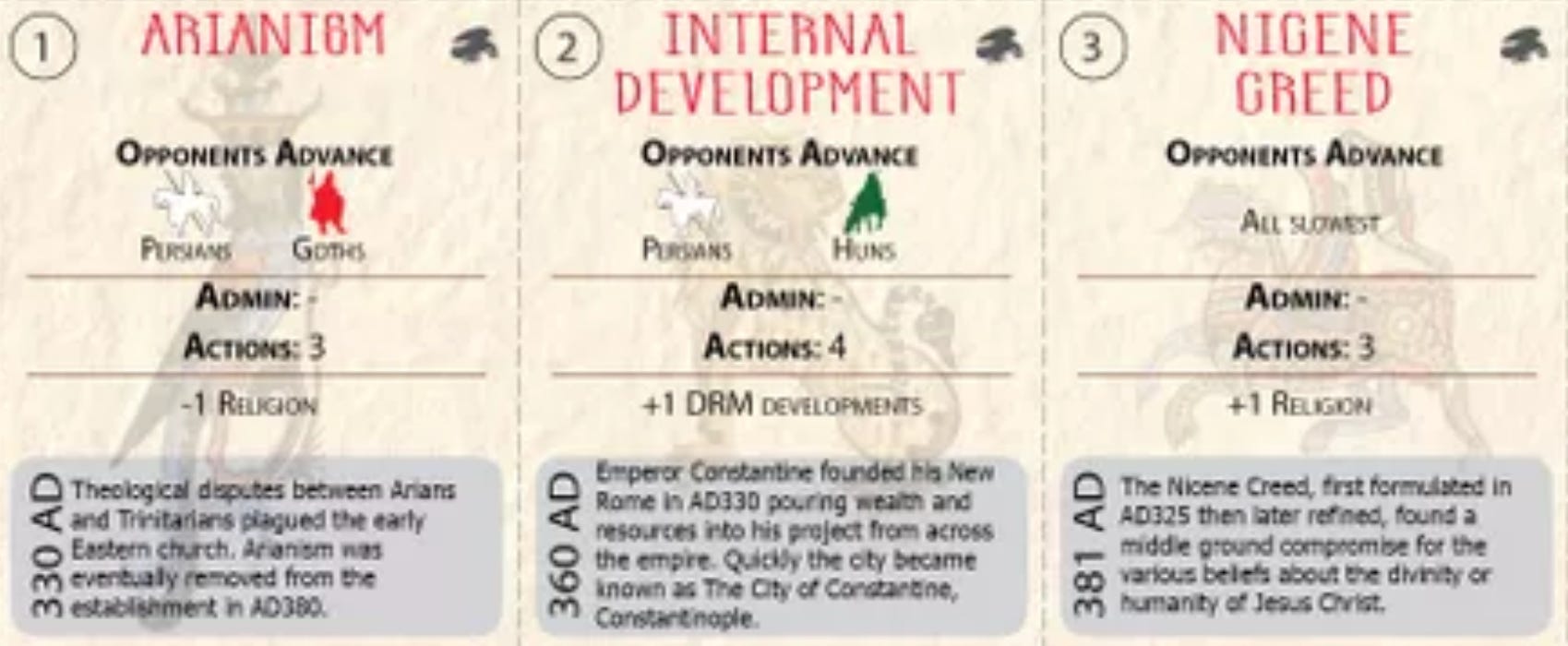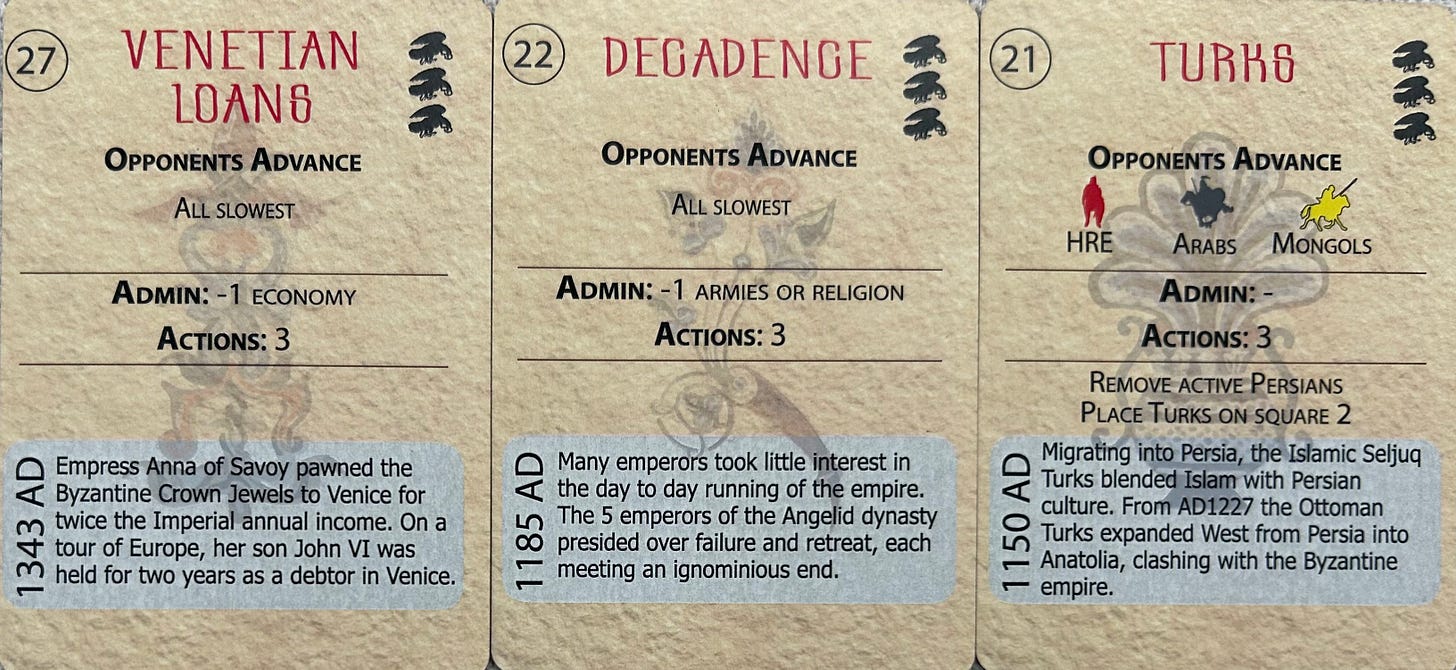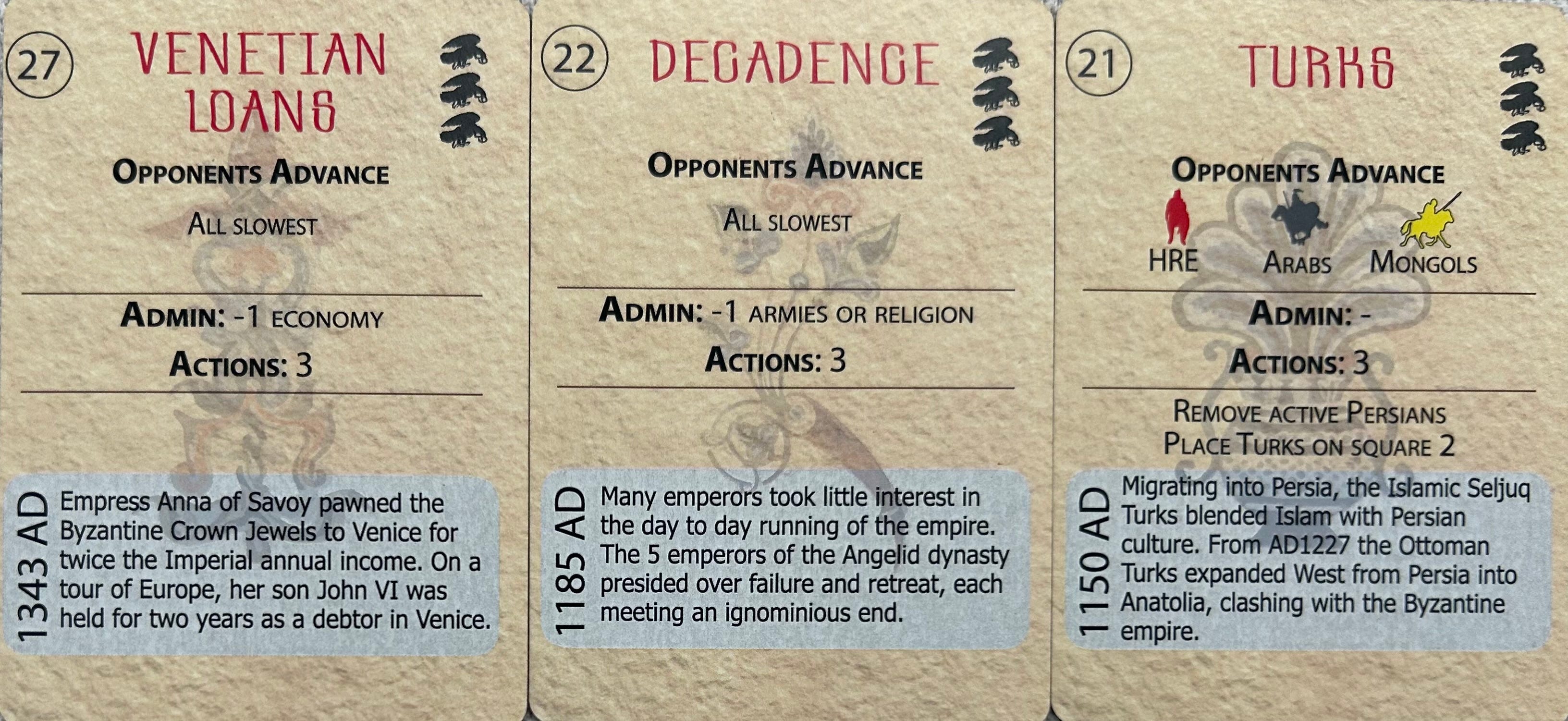 My first iteration of cards divided the history of the Byzantine empire into the various emperors and dynasties. This approach drove very unhistorical play as many dynasties lasted just a few years and others for many decades. Then I moved to equal duration periods of Byzantine history, around say 30 years each. I took the key historical events in each period and used that as the next iteration of event cards.