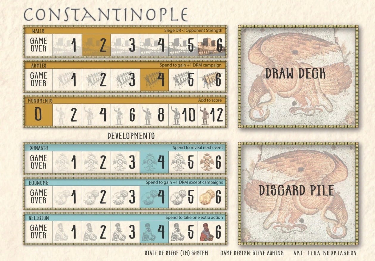 Then, I stumbled upon the States of Siege system. I quickly realized it was perfect for Constantinople and revisited the design. It worked immediately. Thereafter, it was just a case of tweaking, rebalancing and refining, until I had a game that was sufficiently challenging with a reasonable balance of strategy, tactics and luck.