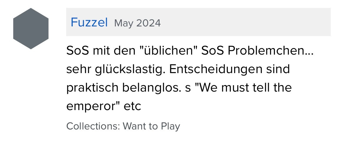 I always enjoy reading the negative comments about games on BGG. Sometimes, they are thoughtful and insightful, more so than those happy comments. Alas, more typically, they are rife with ignorance and revealing of the gamer’s inner id. For some reason, reading them in German is most satisfying. The pleasure comes from the observation that said gamer knows absolutely nothing about how to play the game properly.